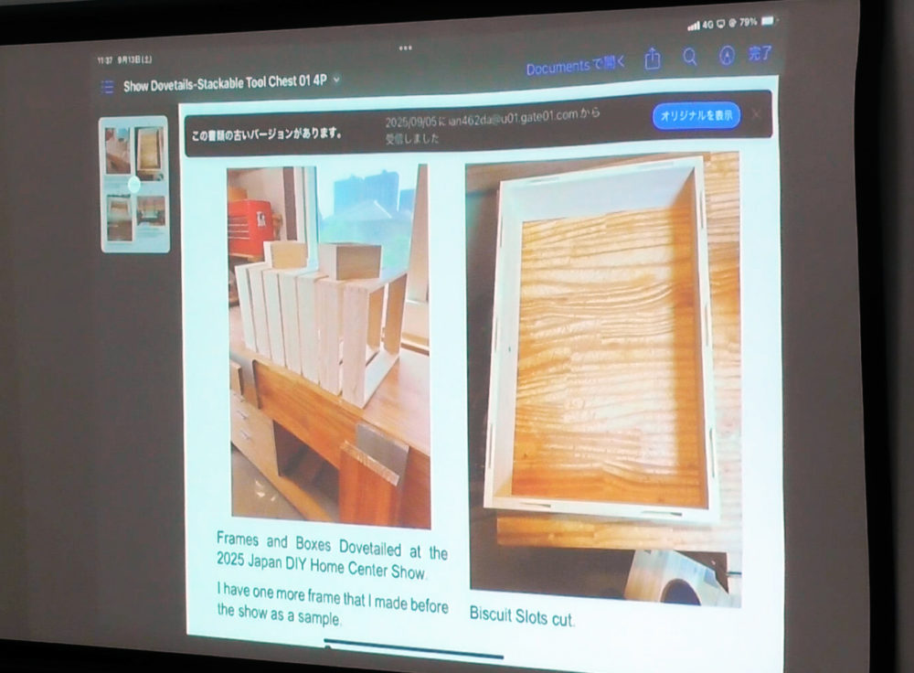 Mr. Dalton is returning to the UK this month and next month for a break. This time, he presented the photos entrusted to Mr. Sugita. At last month’s DIY show, he demonstrated making numerous frames using dovetail joints. This slideshow shows the process of docking them all together to form the cabinet body. At the DIY show, demonstrating the entire dovetail joint process takes too long, and visitors get bored. So, he planned to make frames that could be completed relatively quickly. Since he wanted a cabinet himself, he decided to join the frames using a biscuit joiner.