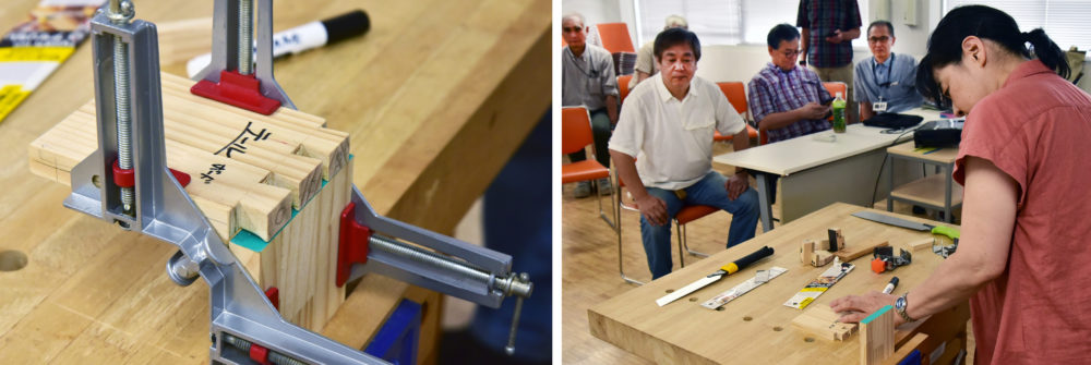 Ms. Moroi demonstrated her unique dovetail technique. When it came time to actually cut the wood, Mr. Yamano, who had been watching, decided to try it himself. He cut the tail first, then the pin. The resulting dovetail joint was perfectly tight and superb.